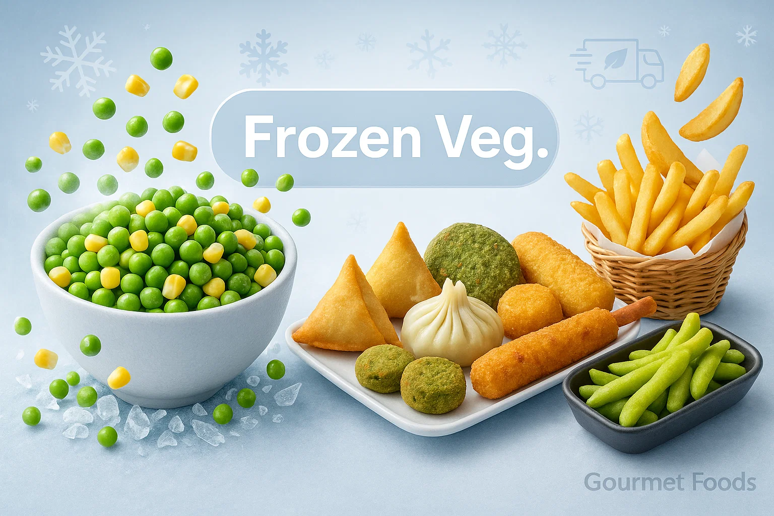 Peas, corn, mixed veg & snack lines (fries, wedges, momos). Farm-fresh, frozen to lock nutrition and consistency.