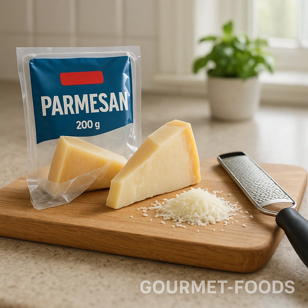 - Authentic Italian Parmesan (grana-style) wedge, vacuum-sealed.